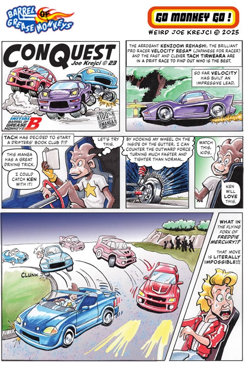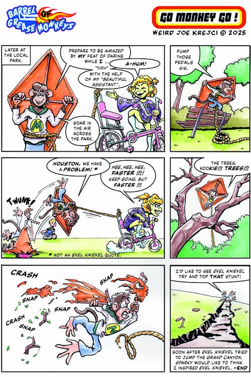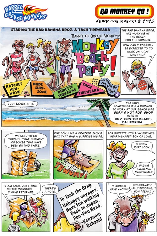 Got car problems? Who ya gonna call? Barrel Of Grease Monkeys! These looney monkeys are a force of Car-Ma in a car-crazy world. Maybe they are zany because they spend too much time in their barrels. People get the help they deserve from the grease monkeys’ unique solutions. Short, humorous, and action-filled comic stories that celebrate car culture and pop culture. All ages.