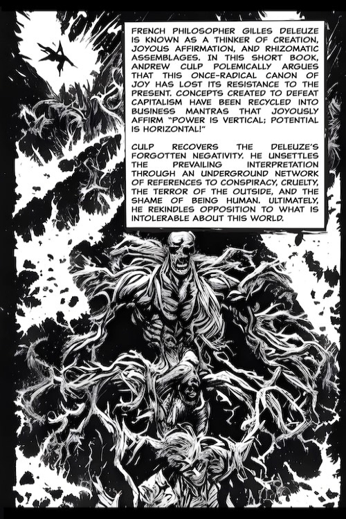 Andrew Culp’s philosophical provocation Dark Deleuze appears here in full, unchanged word for word. Each page is paired with hallucinatory artwork that drags the argument through ruined cities, corrupted flesh, and buried crypts. Philosophy and nightmare share the same panel, tracing a doctrine of revolt across four issues.