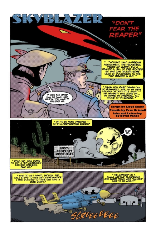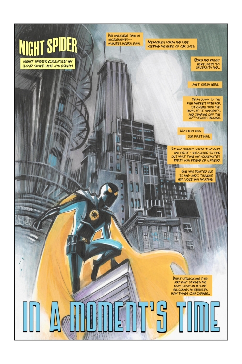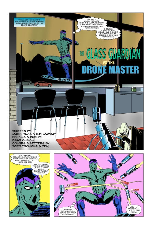Night Spider In a Moment’s Time: Life in New Constantine can be tough. It’s especially tough when the city destroys your loved ones and a hero lets you down. Also: The Glass Guardian battles the Drone Master and his army of sophisticated drones! From robbing a bank to making himself the ruler of the world, the Drone Master means business! Plus the Post WWII mis-adventures of Skyblazer and a Snazzy Unbeatable Brick page.