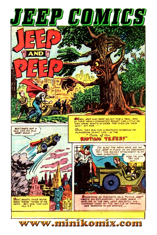 Discharged WWII soldier Jeep gets the brilliant idea to add rocket thrusters to his decommissioned jeep and gives it the power of flight. Jeep then puts on a red cape and invites his chubby young partner Peep to join him on rip-roaring adventures. This includes a mad scientist creating an army of killer trees, a criminal swindler, and a swamp full of spooks. Also included are comedy fillers of Simple Seaman and Funifties.