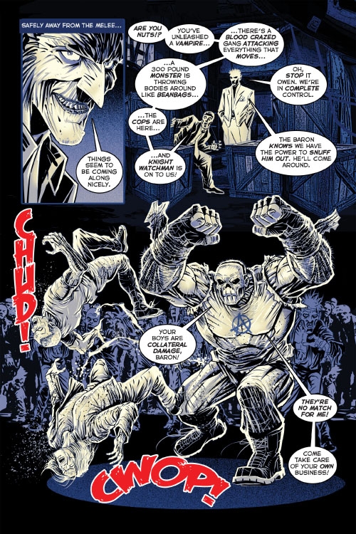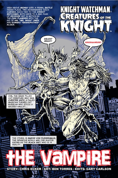 It’s monster madness mayhem as our cast of creatures converge for the finale of Knight Watchman: Creatures of the Knight. Baron Von Fledermaus battles the combined might of Knight Watchman, Chester Katz, The Spook, Red Afterlife Ted McKenna, Detective Peterson and occult expert Inspector Radu Wallach as Pinkerton Pink Flamingo Fleming, Hal, Mr. Mask Owen and Edward Grandfather Klock watch their own mad plan unfold. Klock holds the key to success or failure to the Midway City vampire infestation, but who’s side is he really on? Plus, the Golden Age classic The Time Crimes of Grandfather Clock!