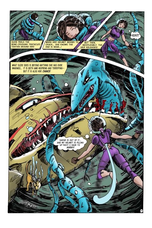 Space gal Suzie Steam and her faithful German Shepherd Sarge traverse the space-ways in the distant future. She isn’t looking for trouble, but it always seems to find her! Also in this comic are behind-the scenes text pieces and a pinup gallery.