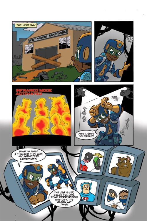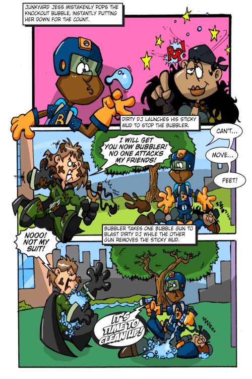 Bubbler faces his foes, Junkyard Jess, Patman, and Dirty DJ. Xavier wrote this comic from when he was five years old to thirteen years old. Watch as the character develops.