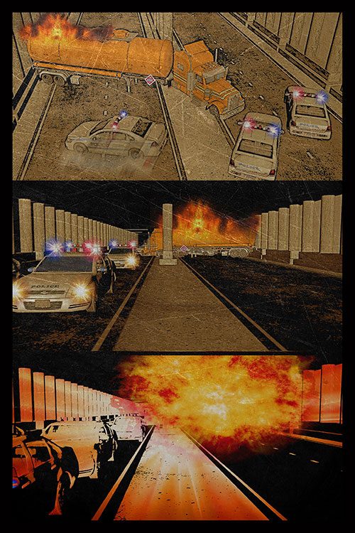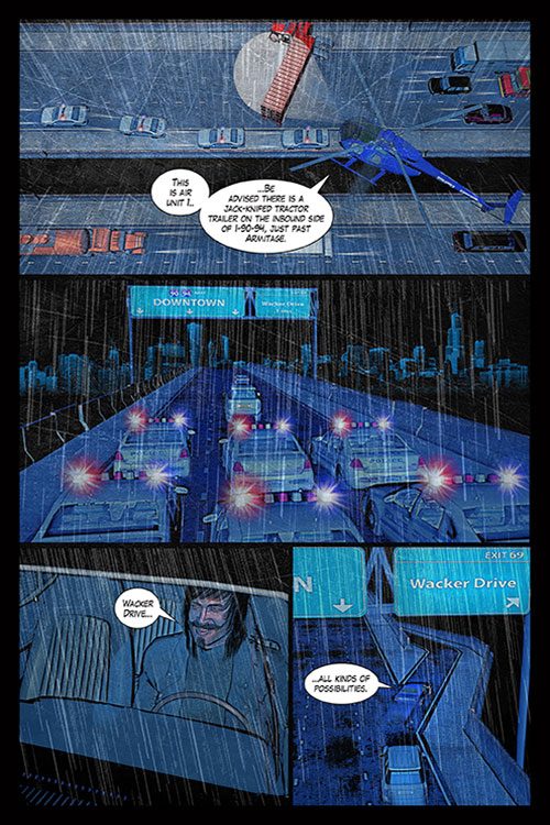 After narrowly avoiding a head-on collision with a locomotive freight train, the chase continues as Angus leads the heroes all over the city: the expressway, Lower Wacker Driver, and under the Lake Street Elevated tracks.